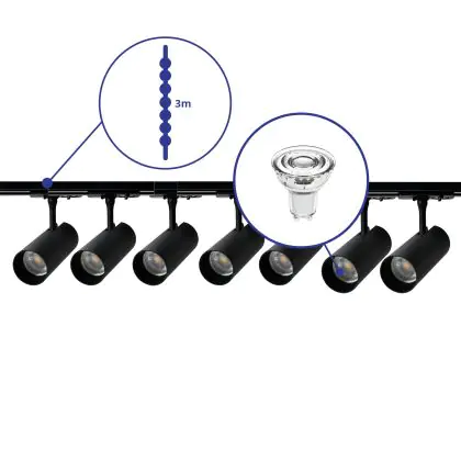 Beschreibung Bright Choice Komplettset 1-Phasen Rail 3 Meter Schwarz | incl. 7x Spot + GU10 2700K 3W Dimmbar + Abschlusskappe, Stromanschluss und I-Verbinder