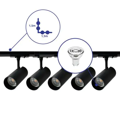 | Herstellername | Complete L shaped 1-Phase Track Set Black incl. 5x Spot fixture + GU10 2700K 3W Dim – 1,5 x 1,5 mete | |