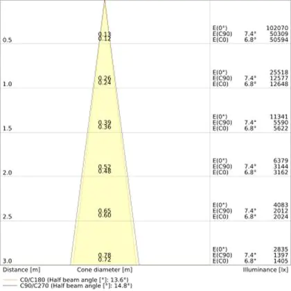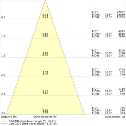 Der Abstrahlwinkel bezeichnet den Winkel, in dem das Licht aus der Lichtquelle ausgestrahlt wird. Er wird in Grad (D) angegeben. Je geringer die Gradzahl des Abstrahlwinkels ist, desto kleiner ist auch der Durchmesser des Lichtkegels, den die Lichtquelle produziert. Beispiel: Wird eine Lampe mit einem Abstrahlwinkel von 60 Grad an der Decke (2,5 m Höhe) angebracht, erzeugt sie einen Lichtkegel von 2,9 Metern Durchmesser. Hat die Lampe hingegen einen Abstrahlwinkel von 120 Grad, beträgt der Lichtkegel 8,7 Meter im Durchmesser. |