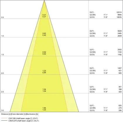 Der Abstrahlwinkel bezeichnet den Winkel, in dem das Licht aus der Lichtquelle ausgestrahlt wird. Er wird in Grad (D) angegeben. Je geringer die Gradzahl des Abstrahlwinkels ist, desto kleiner ist auch der Durchmesser des Lichtkegels, den die Lichtquelle produziert. Beispiel: Wird eine Lampe mit einem Abstrahlwinkel von 60 Grad an der Decke (2,5 m Höhe) angebracht, erzeugt sie einen Lichtkegel von 2,9 Metern Durchmesser. Hat die Lampe hingegen einen Abstrahlwinkel von 120 Grad, beträgt der Lichtkegel 8,7 Meter im Durchmesser. |