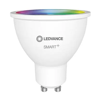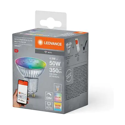 Die Mehrfachpackung 4x Ledvance Smart+ Wifi GU10 Spot 5W 350lm 45D - 827-865 Abstimmbares Weiß | RGBW - Dimmbar - Ersatz Für 50W ist eine effiziente GU10 LED-Lampe und der perfekte Ersatz für Ihre konventionelle Halogenlampe mit 50W und einem GU10-Sockel, bei welchem die zwei Stifte einen Abstand von 10 mm zueinander haben. Zudem strahlt das Produkt Licht in der Farbtemperatur aus und punktet durch eine lange Lebensdauer.