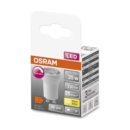Die Mehrfachpackung 6x Osram LED Superstar Reflektor Spot GU10 PAR16 3W 230lm 36D - 827 Extra Warmweiß | Dimmbar - Ersatz Für 35W ist eine effiziente GU10 LED-Lampe und der perfekte Ersatz für Ihre konventionelle Halogenlampe mit 35W und einem GU10-Sockel, bei welchem die zwei Stifte einen Abstand von 10 mm zueinander haben. Zudem strahlt das Produkt Licht in der Farbtemperatur aus und punktet durch eine lange Lebensdauer.