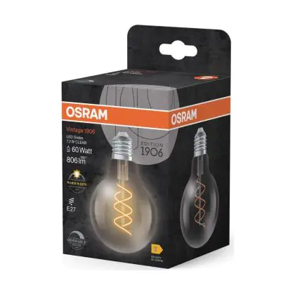 Die Osram Vintage 1906 LED E27 Globe Fadenlampe Twist Klar 7.2W 806lm - 927 Extra Warmweiß | Höchste Farbwiedergabe - Dimmbar - Ersatz Für 60W ist eine effiziente E27 LED-Lampe mit Retrodesign und der perfekte Ersatz für Ihre konventionellen 60W Lampen mit E27. Zudem strahlt sie Licht in der Farbtemperatur 2700K - Extra Warmweiß aus und punktet durch eine lange Lebensdauer.