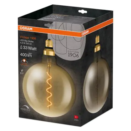 Beschreibung Osram Vintage 1906 LED E27 Globe Filament Gold 200mm 4.8W 400lm - 822 Extra Warm White | Dimmable